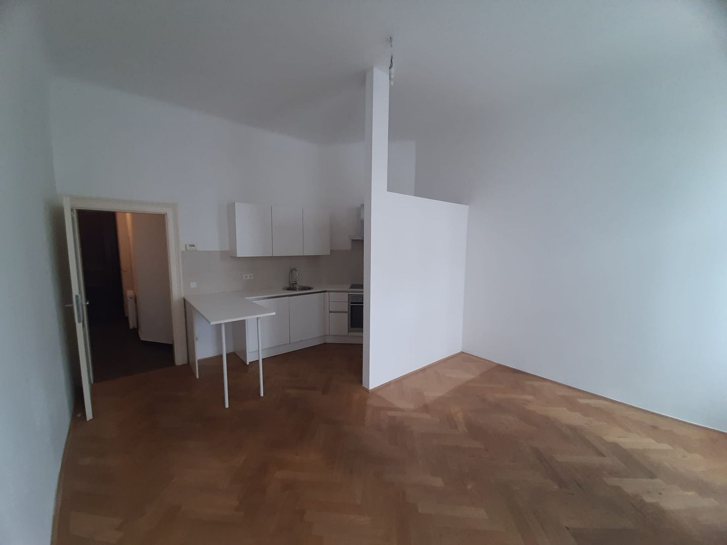 UNBEFRISTETE SINGLEMIETE/ NÄHE U3! Wohnzimmer mit Einbauküche, Vorraum, Fliesenbad/WC, Gesamtmiete 599,--